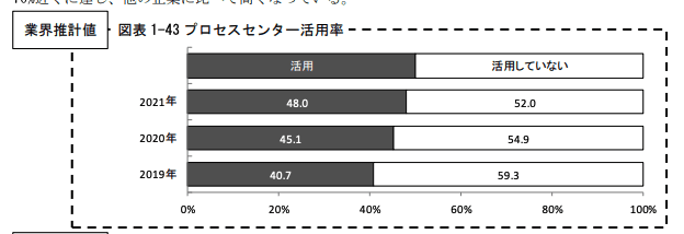 全国スーパーマーケット協会・オール日本スーパーマーケット協会・日本スーパーマーケット協会により、2021年に発表された「スーパーマーケット年次調査報告」によると、2020年に45.1%、2021年には48%ががプロセスセンターを活用している状況です。プロセスセンターの活用率は年々増加している結果となっています。